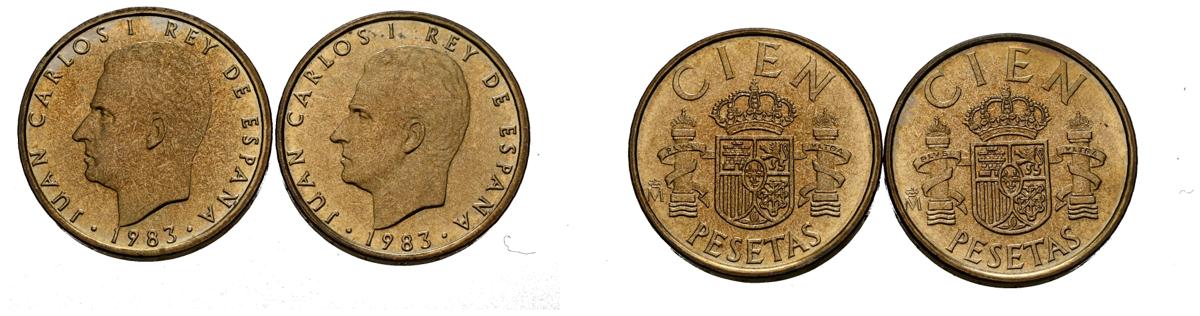JUAN CARLOS I (1975-2014). Conjunto de 2 monedas de 100 Pesetas de 1983 con flores de lis, en el canto, hacia arriba y hacia abajo en el canto. EBC-.