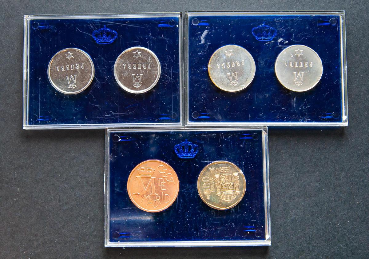 JUAN CARLOS I (1975-2014). 500 Pesetas. Pruebas de la FNMT. Estuche conmemorativo XXV Aniversario de la Boda de los Reyes Juan Carlos I y Sofía. El set incluye 6 monedas y librito Así nace una moneda". 1987. SC.