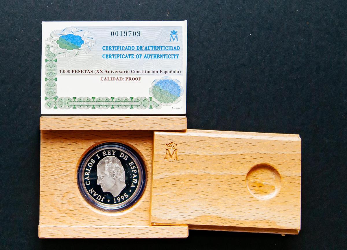 JUAN CARLOS I (1975-2014). 1000 Pesetas. (Ar. 13,50g/33mm). 1998. FNMT. XX Aniversario de la Constitución Española. PROOF. Presentada en estuche oficial con certificado de autenticidad.