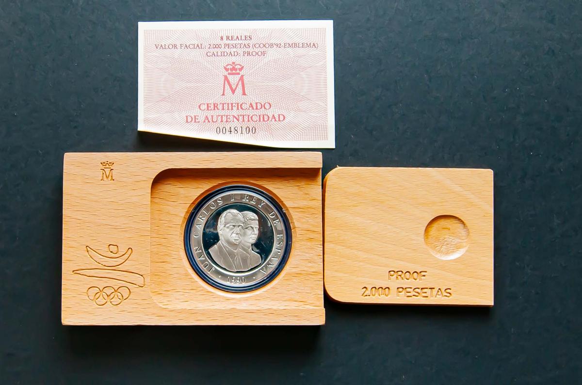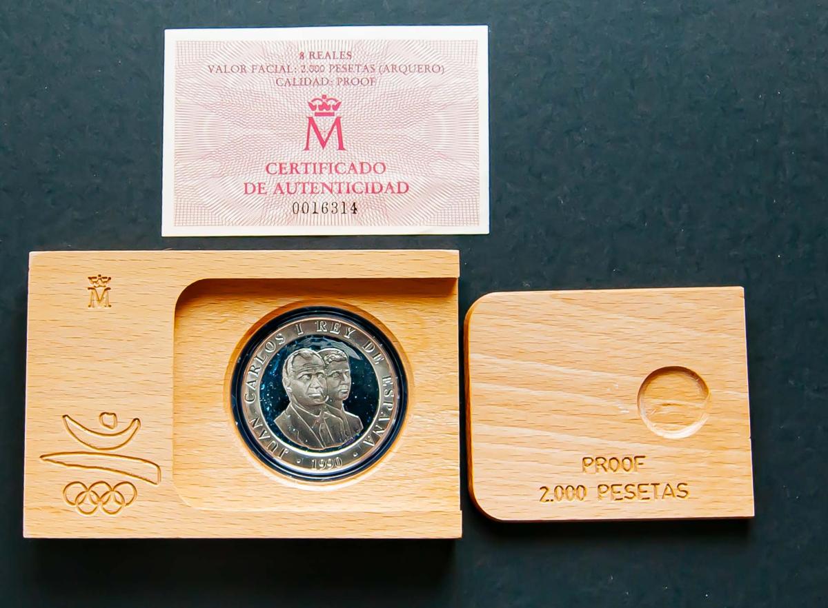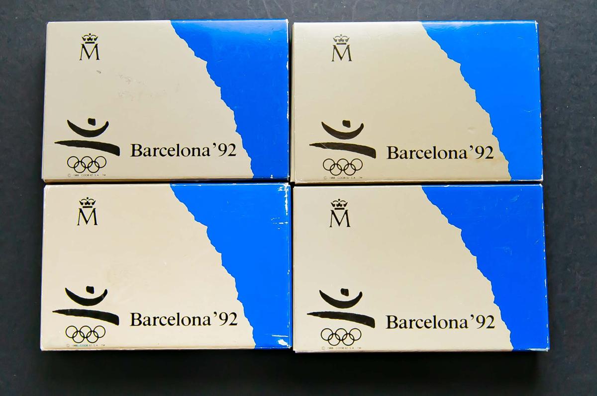JUAN CARLOS I (1975-2104). Conjunto de 4 estuches de 2000 Pesetas acuñados en 1990. Serie Barcelona 92. Todos con diferente temática: Castellers, Arquero Prehistórico, Emblema Oficial y Fúbol. PROOF. Incluyen estuches originales y certificados de autenticidad. A EXAMINAR.
