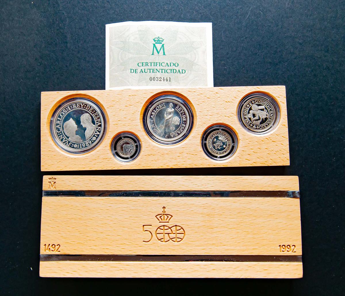 JUAN CARLOS I (1975-2014). Estuche completo compuesto por 5 monedas en plata de valores comprendidos entre 2000 y 100 Pesetas. Quinto Centenario. 1989. Serie I. FNMT. FDC. Incluye estuche original y certificado de autenticidad.