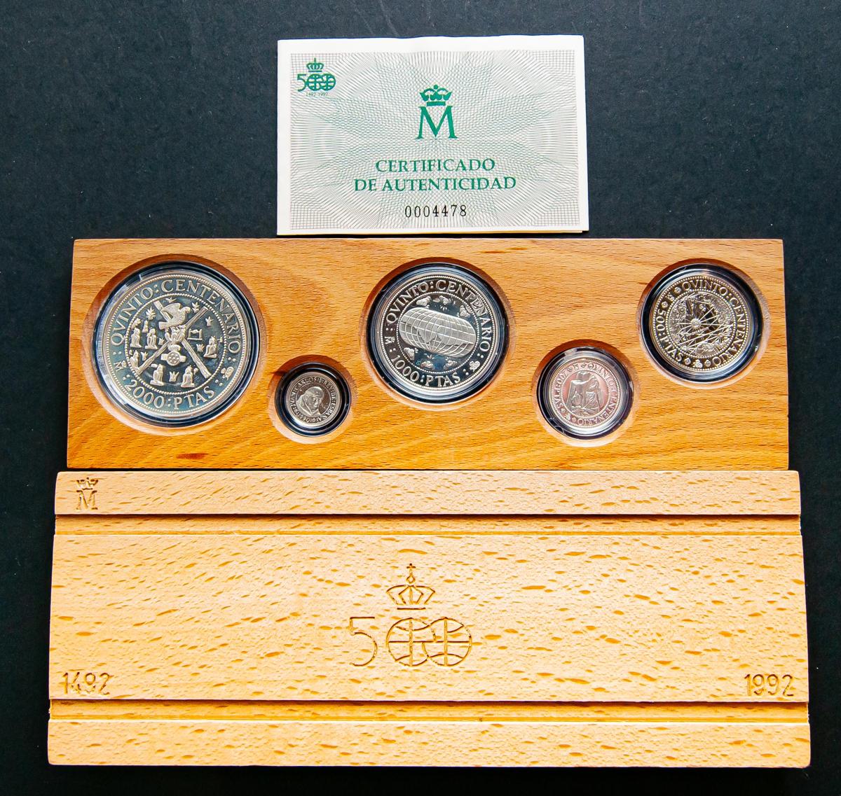 JUAN CARLOS I (1975-2014). Estuche completo compuesto por 5 monedas en plata de valores comprendidos entre 2000 y 100 Pesetas. Quinto Centenario. 1990. Serie II. FNMT. FDC. Incluye estuche original y certificado de autenticidad.