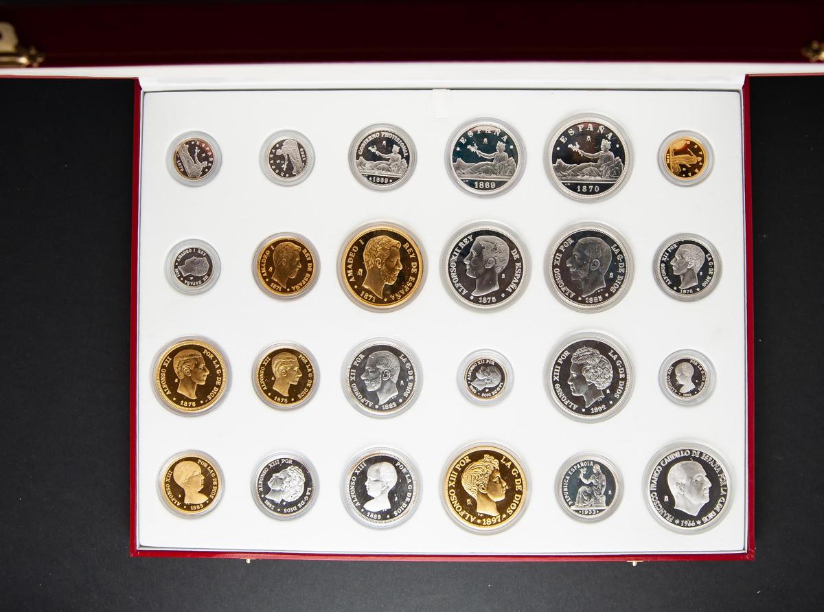 JUAN CARLOS I (1975-2014). Historia de la Peseta. Emisión de las réplicas de 24 Monedas icónicas de la numismática española en plata y plata con baño de oro. Plata de 0,925 milésimas (550,82g). PROOF. Incluye estuche original y certificado de autenticidad.