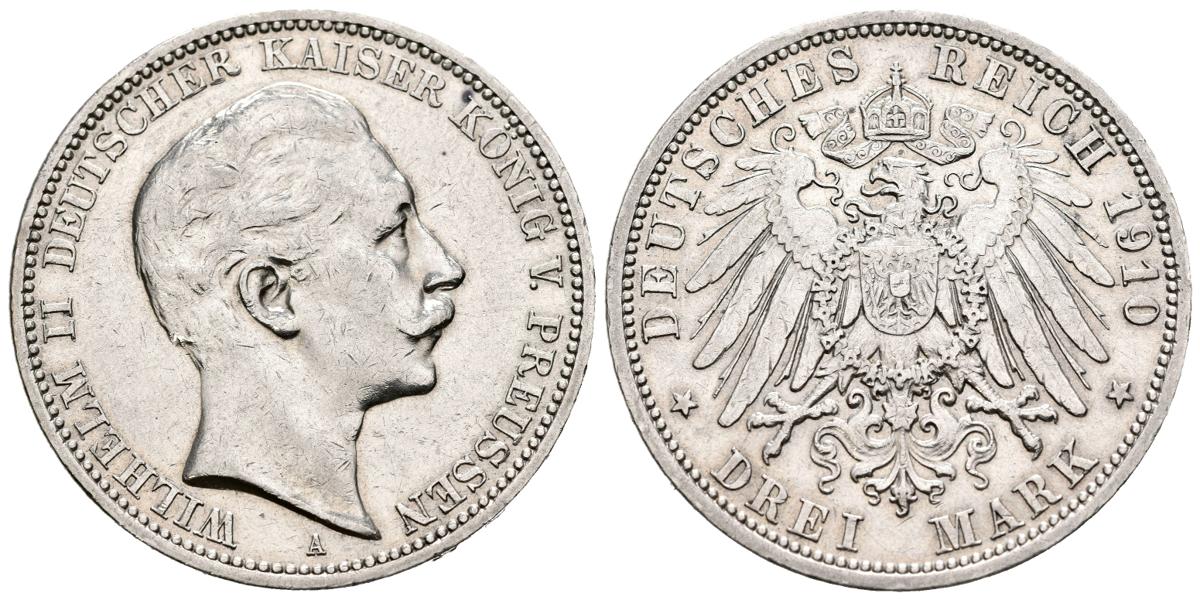 ALEMANIA. 3 Mark. (Ar. 16,62g/33mm). 1910. Berlin A. Imperio Alemán. William II. (Km # 527). MBC+. Limpiada.