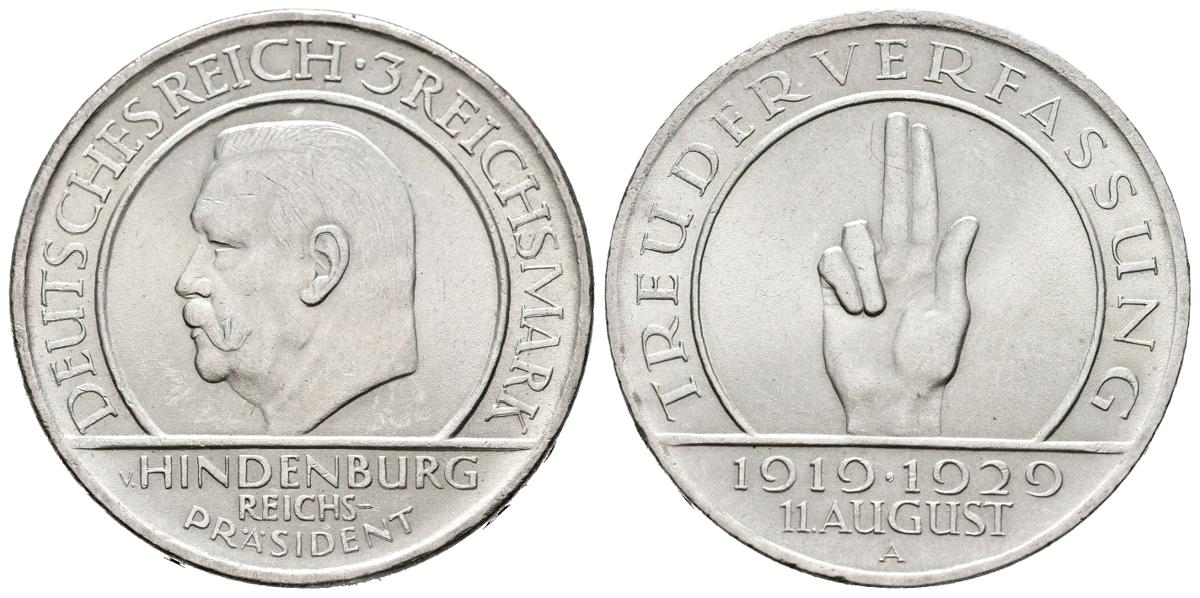 ALEMANIA. 3 Mark. (Ar. 15,02g/30mm). 1929. Berlín A. 10º Aniversario de la Constitución de Weimar (Km#63). EBC.