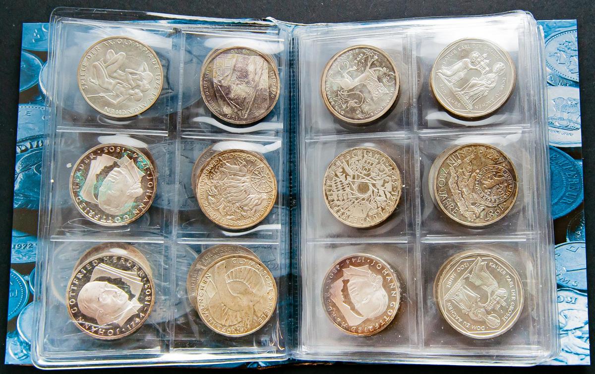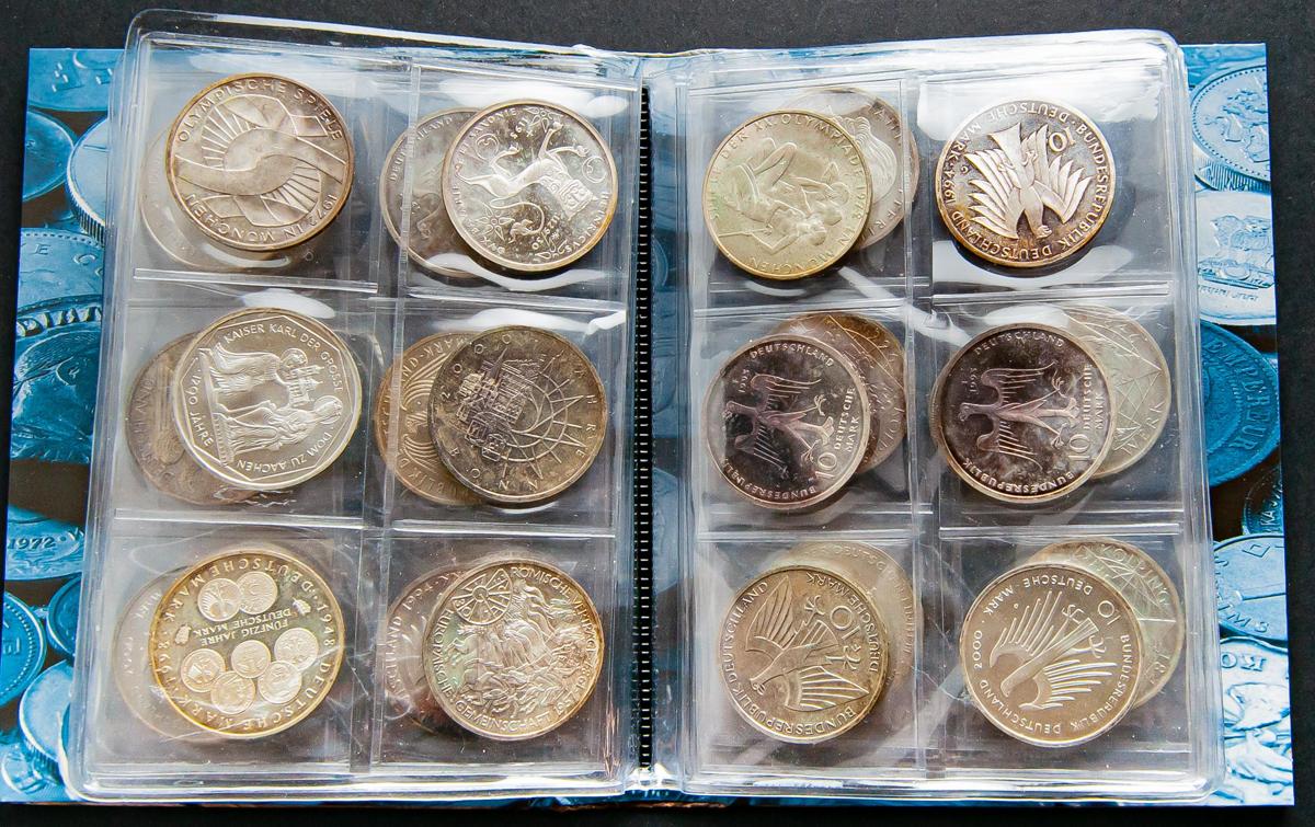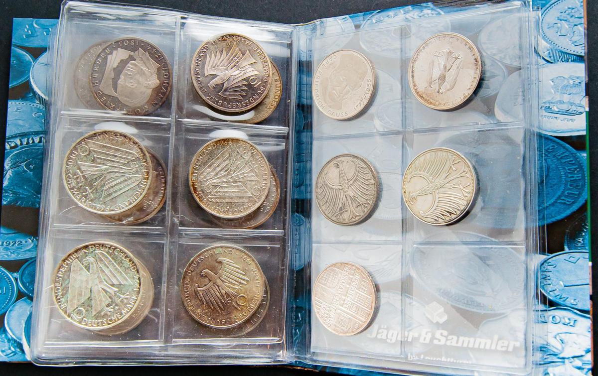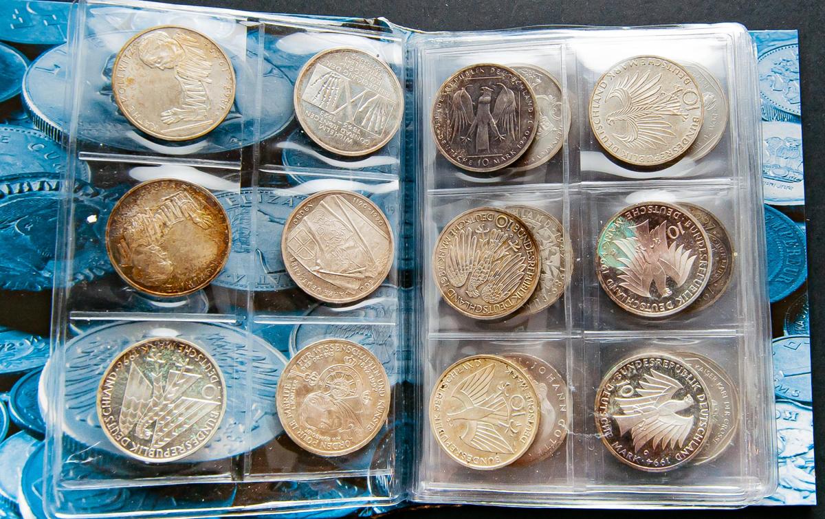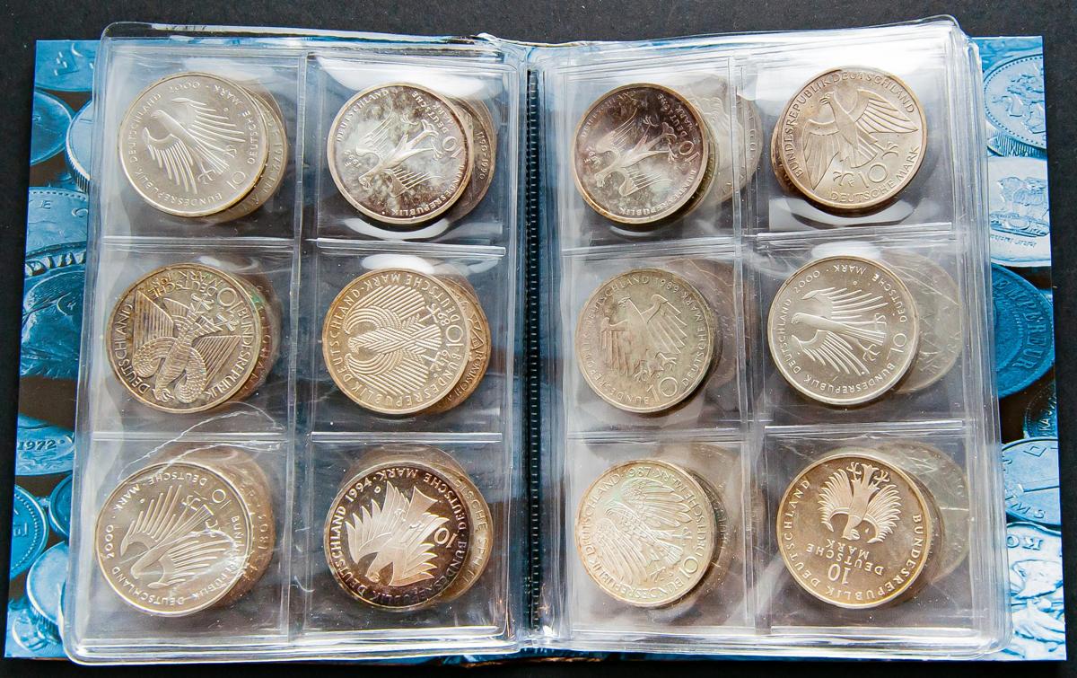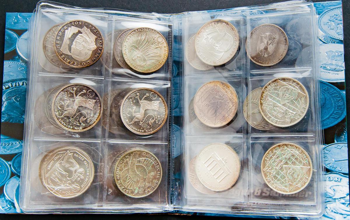 ALEMANIA. Conjunto de decenas de monedas de plata de 5 Y 10 Mark (gran mayoría de ellas) acuñadas a lo largo del siglo XX y presentadas en un pequeño álbum. Peso aproximado del conjunto en plata 550g. Buen estado de conservación en general. A EXAMINAR.