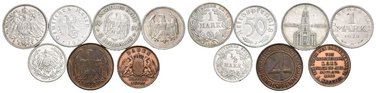ALEMANIA. Precioso conjunto formado por 7 monedas de diferentes módulos y valores acuñadas entre 1868 y 1941, la mayoría de ellas en plata y en un alto nivel de conservación general. A EXAMINAR.