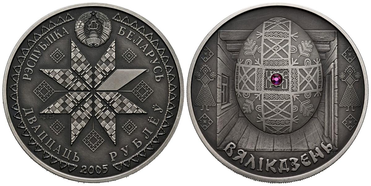 BIELORRUSIA. 20 Rublos. (Ar. 33,70g/39mm). 2005. Festivales y Ritos de Bielorrusia. Pascua. (Km#95). SC. Incrustación de cristal rosa en el centro.