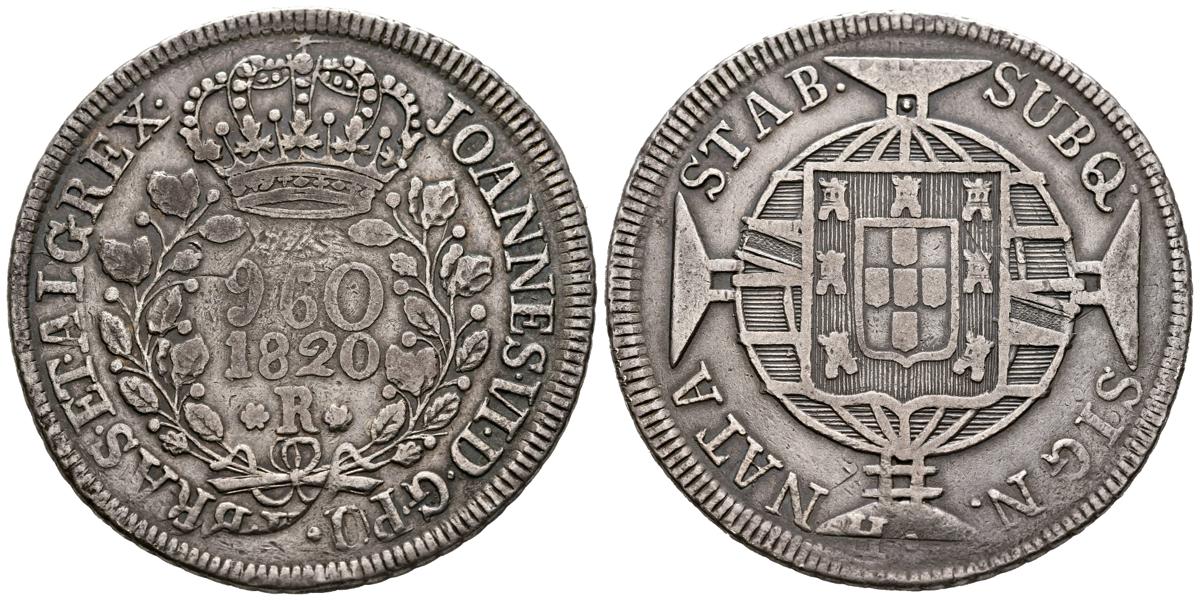 BRASIL. 960 Reis. (Ar. 26,17g/42mm). 1820. D. Joao VI. Río de Janeiro R. (Km#326.1). MBC. Acuñada sobre una moneda de 8 Reales española. Bonito tono.