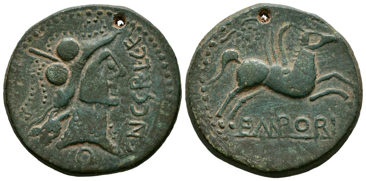 EMPORION (Ampurias, Gerona). As. (Ae. 12,27g/27mm). 50-27 a.C. (FAB-1254). Anv: Cabeza de Palas con casco a derecha, alrededor leyenda: Q CN CG P L CF. Rev: Pegaso a derecha, encima corona de laurel, debajo leyenda: EMPORI. MBC+. Pátina verde. Perforación.