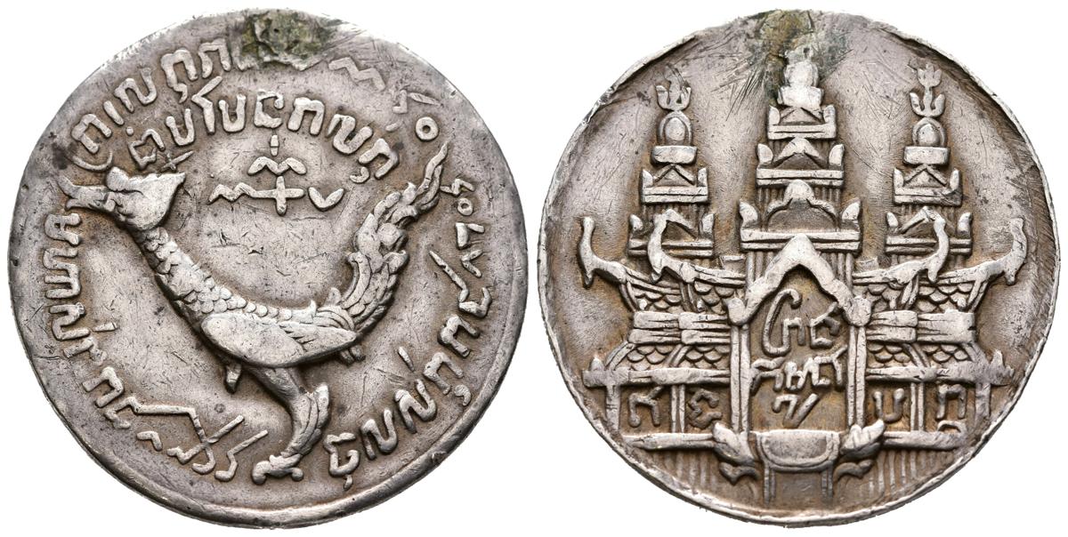 CAMBOYA. Tical. (Ar. 14,77g/35mm). 1847. (Km#37). MBC. Perforación reparada a las 12h. Escaso.