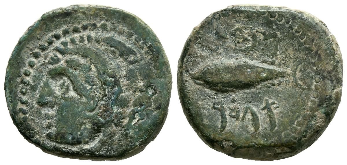 GADES (Cádiz). Semis. (Ae. 5,24g/20mm). 100-20 a.C. (FAB-1345). Anv: Cabeza de Hércules a izquierda con piel de león, detrás clava. Rev: Atún a izquierda, encima y debajo leyenda púnica tipo B. MBC. Pátina verde.