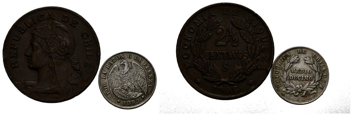 CHILE. Conjunto de 2 monedas de 1/2 Décimo y 2 1/2 Centavos acuñados en 1893 y 1908 respectivamente. Diferentes estados de conservación. A EXAMINAR.