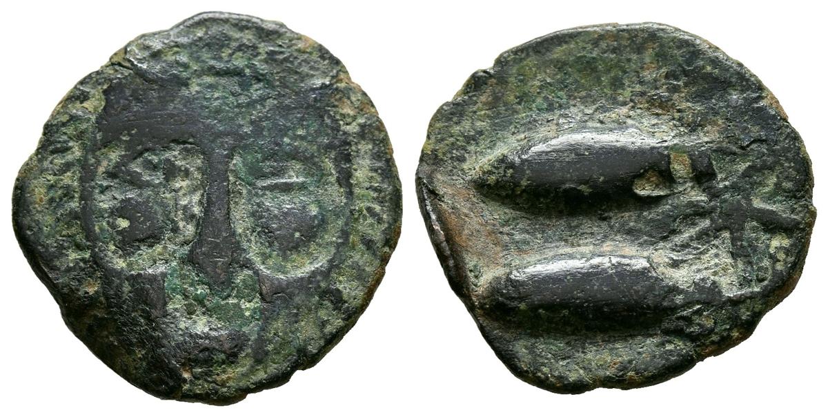 GADES (Cádiz). Calco. (Ae. 2,18g/17mm). 300-200 a.C. (FAB no cita; ACIP no cita). Anv: Cabeza de Melkart de frente con piel de león. Rev: Dos atunes a izquierda. MBC. Contramarca de estrella en reverso. Raro ejemplar.
