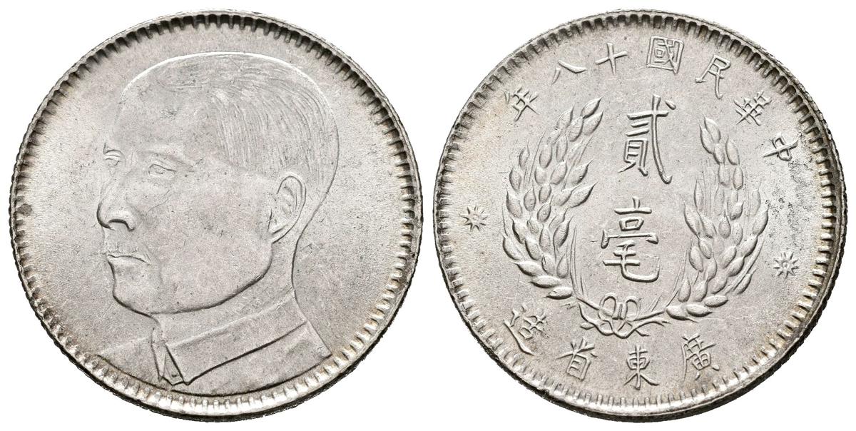 CHINA. 20 Cents. (Ar. 5,35g/23mm). 1929. Provincia de Kwangtung. (Km#426). SC-. Ligeras marquitas. Bonito ejemplar.