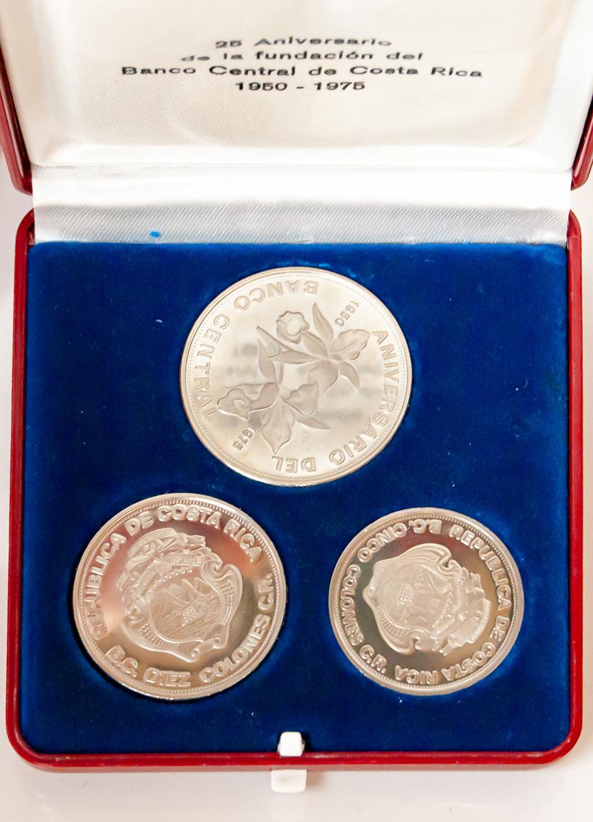 COSTA RICA. Set completo compuesto por 3 monedas de 20, 10 y 5 Colones conmemorativos del XXV Aniversario de la Fundacion del Banco Central de Costa Rica. 1975. SC. Incluye estuche original.