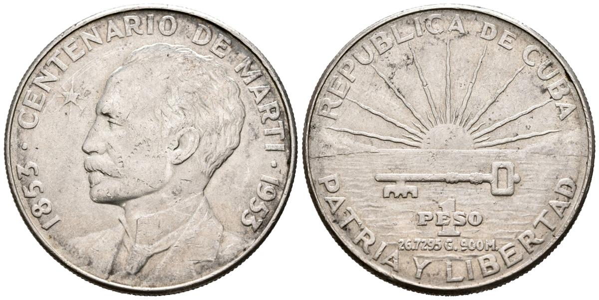 CUBA. 1 Peso. (Ar. 26,69g/38mm). 1953. Centenario del Nacimiento de José Martí (1853-1953). (Km#29). MBC+. Leves marquitas.