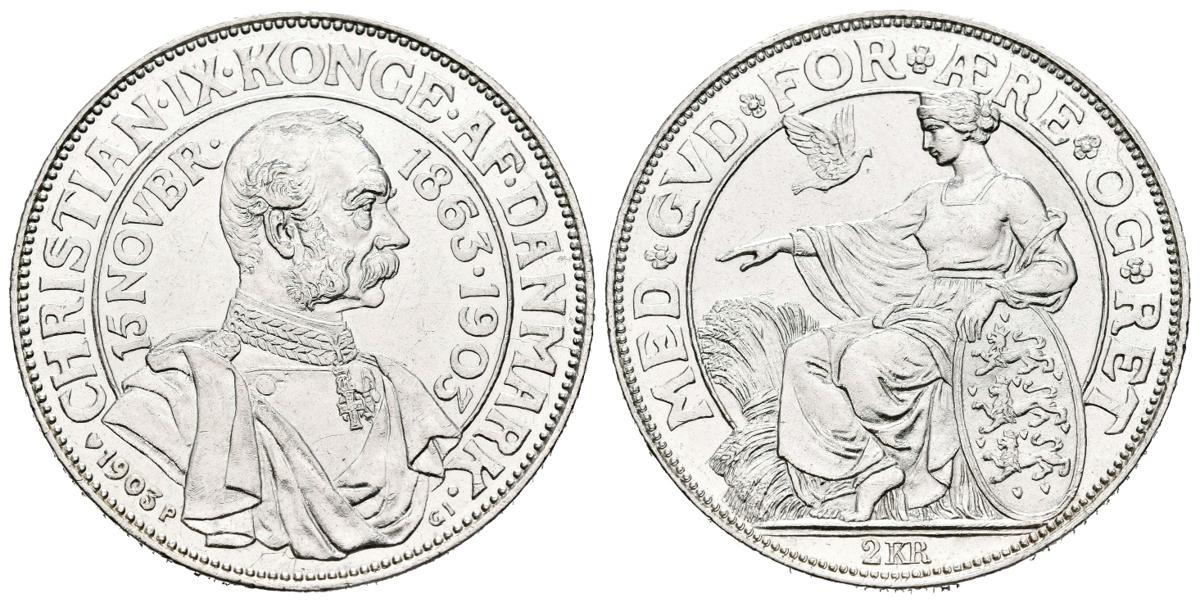 DINAMARCA. 2 Coronas. (Ar. 14,98g/31mm). 1903. Copenhague. 40º Aniversario Reinado de Christian IX. (Km#802). EBC. Ligeras marquitas.