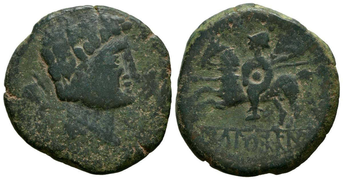 ICALCUNSCEN (Iniesta, Cuenca). As. (Ae. 12,25g/27mm). 120-20 a.C. (FAB-1413). Anv: Cabeza masculina a derecha, detrás delfín, delante estrella. Rev: Jinete con escudo y lanza a izquierda, debajo leyenda ibérica curva: ICaLCuNSCeN. MBC-. Pátina verde.