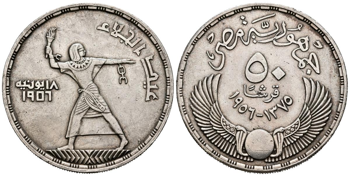 EGIPTO. 50 Piastras. (Ar. 27,98g/40mm). 1956. Gamal Abdel Nasser. (Km#386). MBC+. Bonito tono.