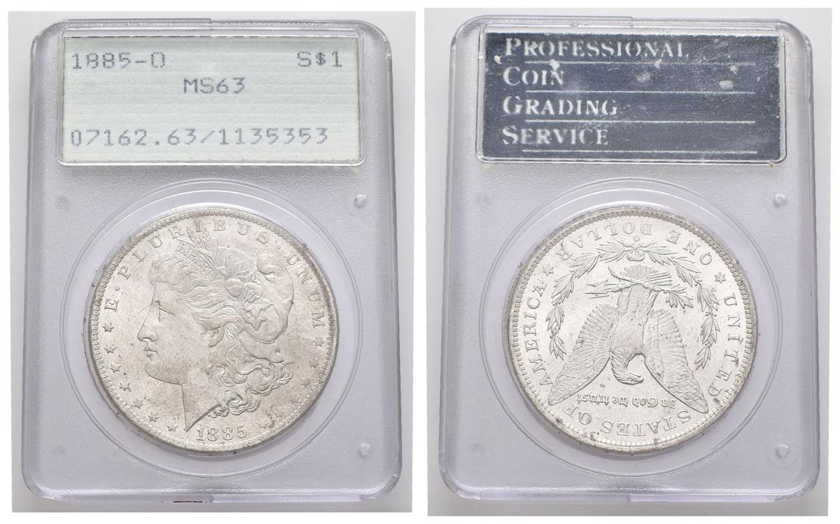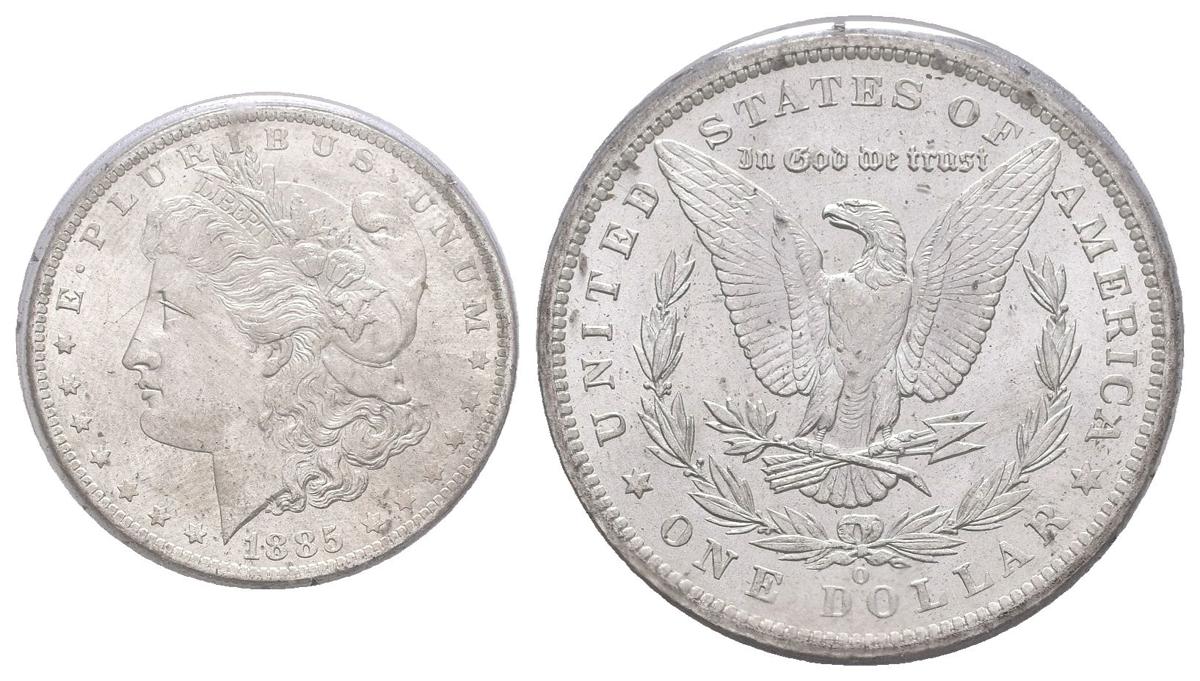 ESTADOS UNIDOS. 1 Dollar (Ar. 26,73g/38mm)*. 1885. Nueva Orelans O. (Km#110). MS 63. Encapsulado por PCGS. *Peso y medida teórico.