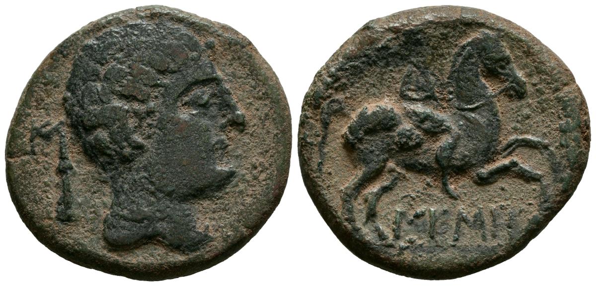 IESO (Guisona, Lérida). As. (Ae. 13,51g/29mm). 120-20 a.C. (FAB-1422). Anv: Cabeza masculina a derecha, detrás letra ibérica N y clava. Rev: Jinete con palma a derecha, debajo leyenda ibérica: IESO. MBC. Raro ejemplar.