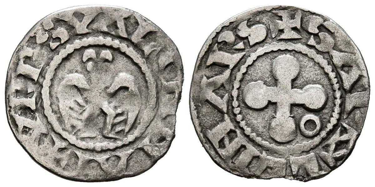FRANCIA, Obispado de Valence y Die (Anónimo). Dinero. (Ar. 1,10g/18mm). 1157-1276. (Poey D'Avant 4690). Anv: Angel de frente, alrededor leyenda: URBS VALENTIAI. Rev: Cruz, alrededor leyenda: S.APOLLINARS. MBC+. Bonito ejemplar.
