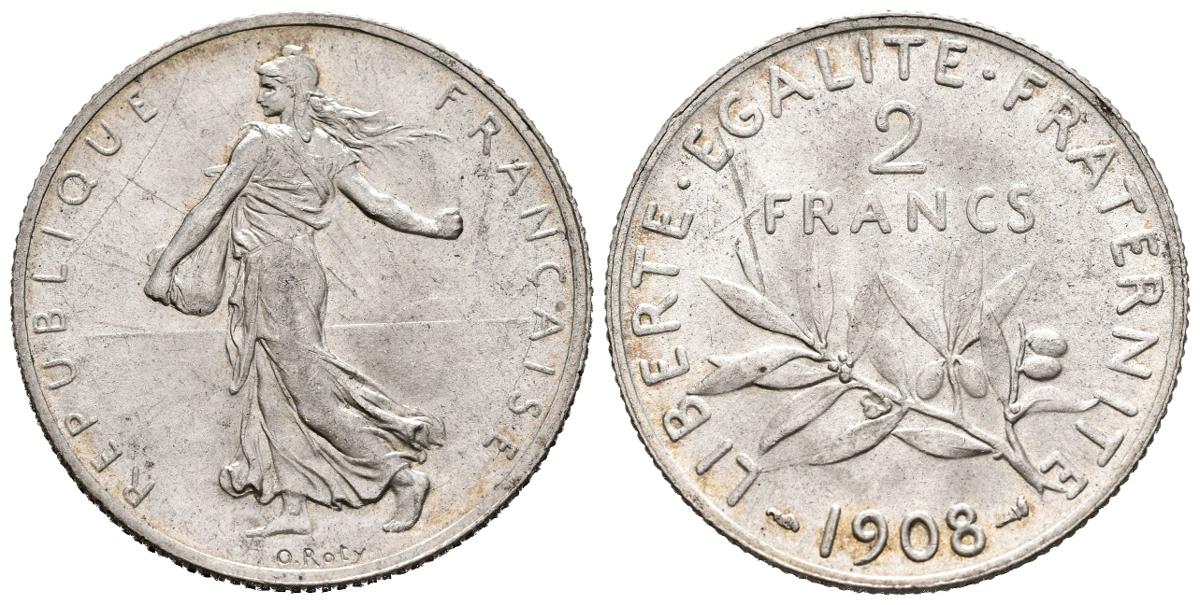 FRANCIA. 2 Francs. (Ar. 10,00g/27mm). 1908. París. (Km#845). SC-.