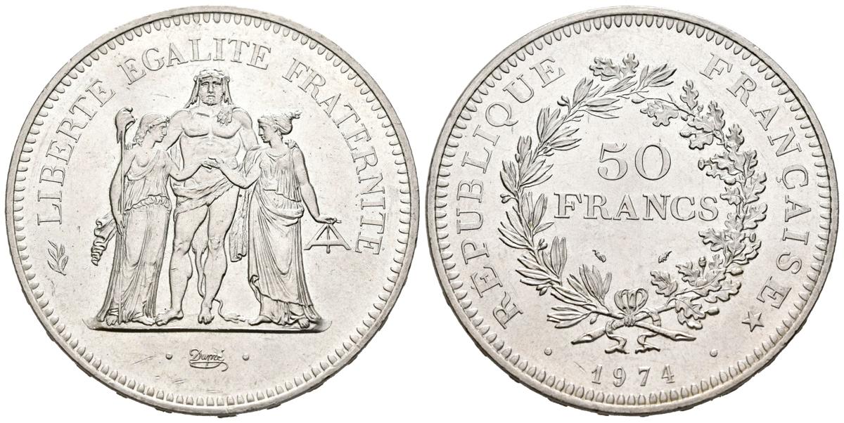 FRANCIA. 50 Francs. (Ar. 29,97g/41mm). 1974. Hércules. (Km#941). EBC+. Leves marquitas