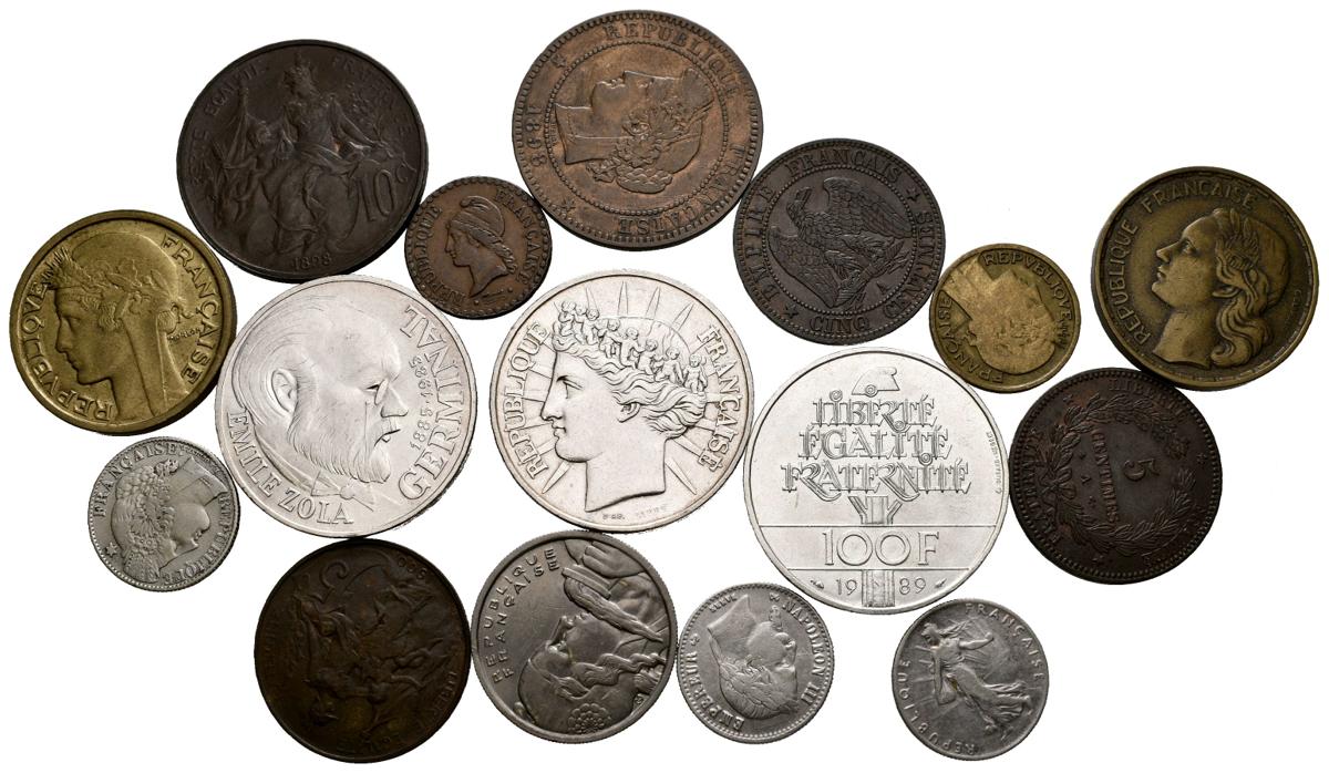 FRANCIA. Interesante y bonito conjunto formado por 16 monedas acuñadas entre 1849 y 1989 con una gran variedad de módulos y materiales incluyendo la plata. Destacan piezas de la época tanto del Imperio como de diferentes etapas republicanas. Buen nivel de conservación general con bronces muy bonitos. A EXAMINAR.