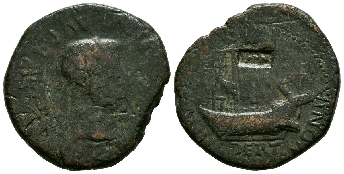 ILERGAVONIA (Tortosa, Tarragona). As. (Ae. 8,79g/24mm). 14-36 d.C. (FAB-1492). Anv: Cabeza laureada de Tiberio a derecha, alrededor leyenda: TI CAESAR DIVI AVG AVGVSTVS. Rev: Nave, debajo: DERT MHI LERGAVONI. MBC-/MBC. Escaso ejemplar. Resello de rama en cartela.