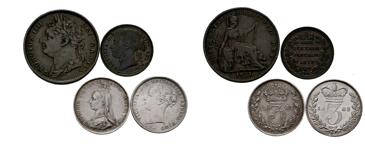 GRAN BRETAÑA. Bonito conjunto de 4 monedas de diferentes valores, materiales (incluyendo la plata) y fechas acuñadas entre 1821 y 1887. Diferentes estados de conservación. A EXAMINAR.