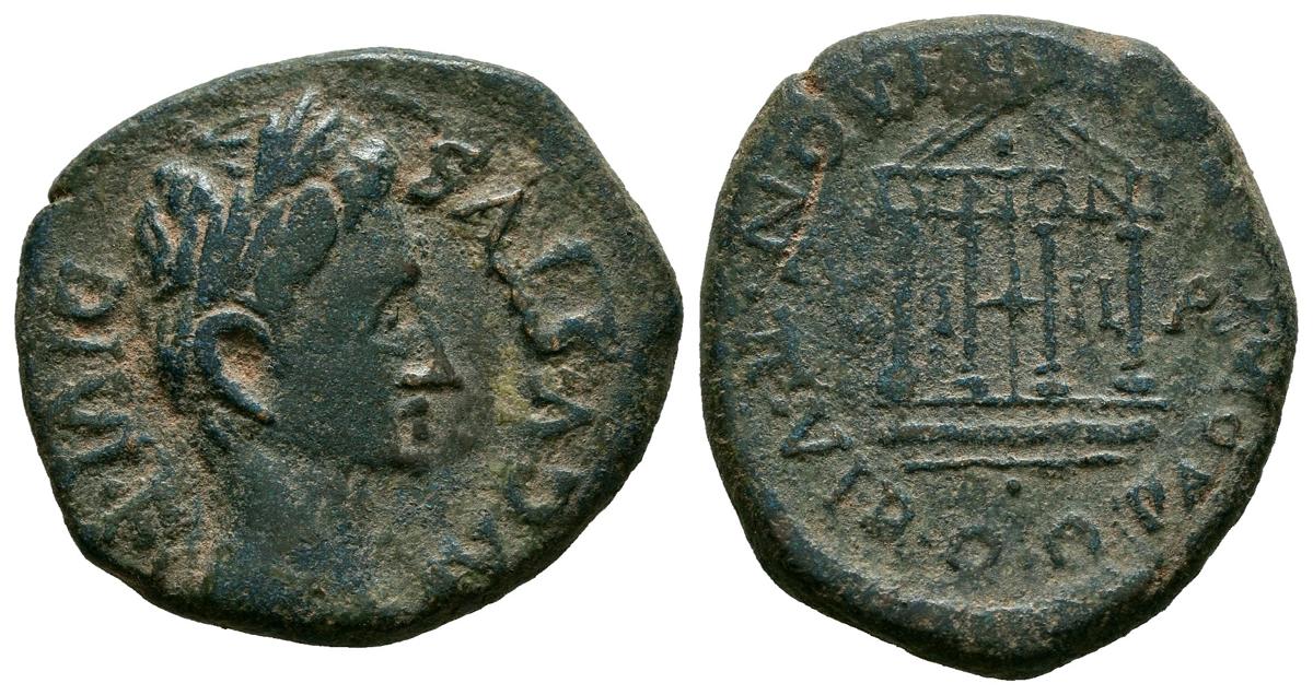 ILICI (Elche, Alicante). Semis. (Ae. 5,36g/21mm). 27 a.C.-14 d.C. (FAB-1519). Anv: Cabeza laureada de Augusto a derecha, alrededor leyenda: AVGVSTVS. DIVI. F. Rev: Templo tetrástilo, en el arquitrave: IVNONI, entre las columnas: C.I.I.A., alrededor: Q. PAPIR. CAR. Q. TERE. MONT. II. VIR. Q. MBC.