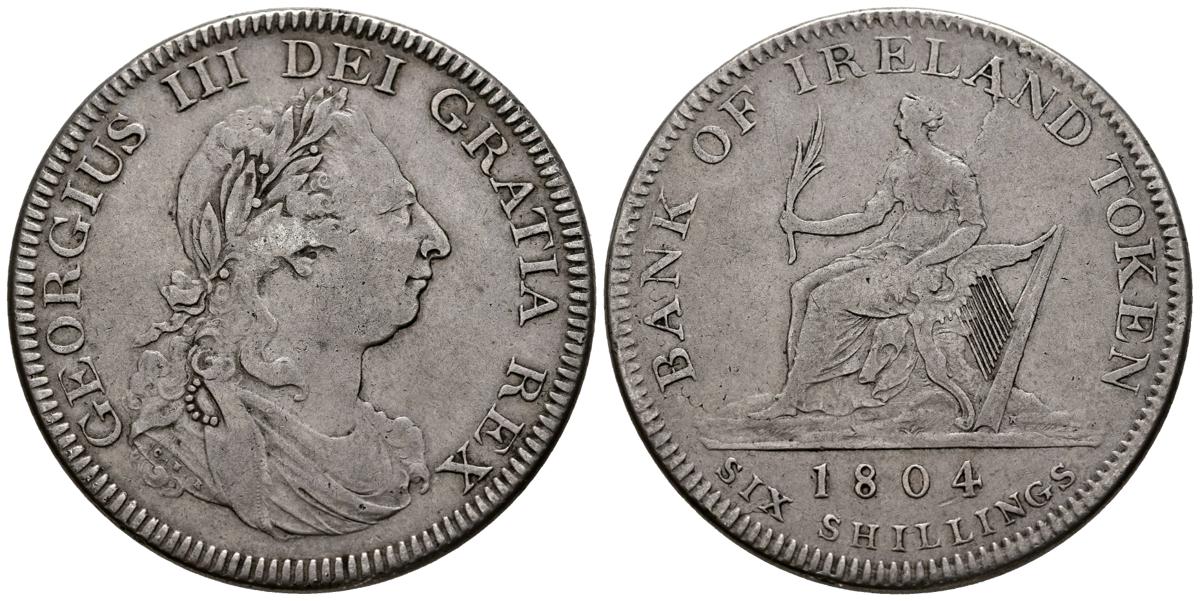 IRLANDA, Jorge III. 6 Shilling. (Ar. 26,67g/40mm). 1804. (Seaby 6615). MBC+. Ligero tono. Pequeña grieta en reverso. Escaso ejemplar.
