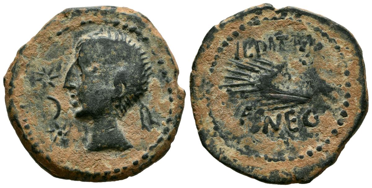 ILITURGI (Mengíbar, Jaén). As. (Ae. 10,46g/27mm). 50 a.C. (FAB-1563). Anv: Cabeza masculina a izquierda, delante dos estrellas y creciente. Rev: Espiga, alrededor leyenda: ILDITVR ESNEG. MBC-. Escaso ejemplar.