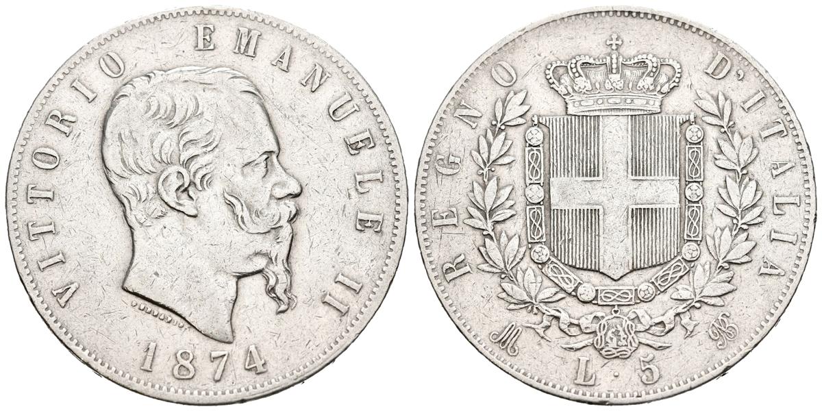 ITALIA. 5 Liras. (Ar. 24,89g/37mm). 1874. Milán. Victor Manuel II. (Km#8.3). MBC. Limpiada.