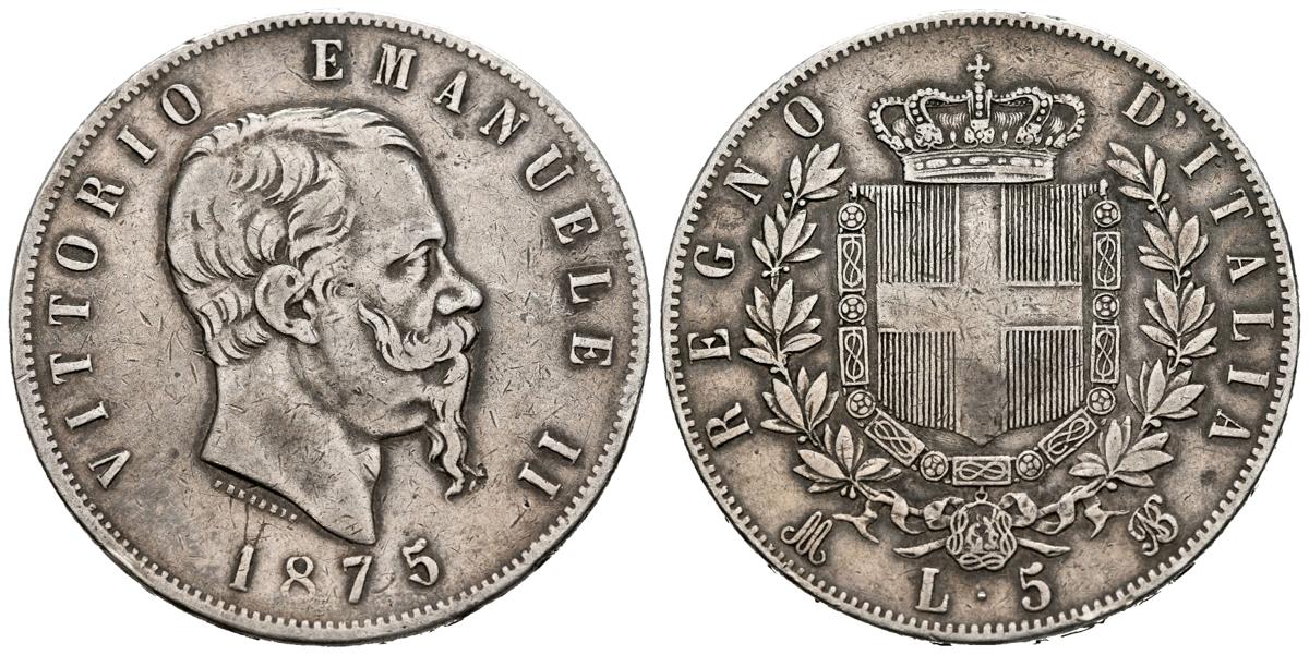 ITALIA. 5 Liras. (Ar. 24,97g/37mm). 1875. Milán. Victor Manuel II. (Km#8.3). MBC.
