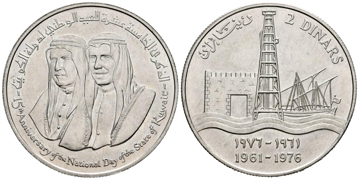 KUWAIT. 2 Dinars. (Ar. 28,26g/39mm). 1976. 15 Aniversario de día Nacional del Estado de Kuwait. (Km#15). SC. Escasa.