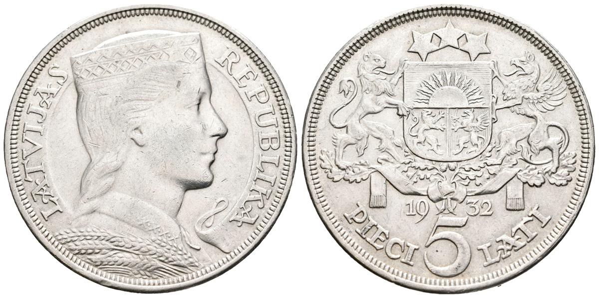 LETONIA. 5 Lati. (Ar. 24,99g /37mm). 1932. Primera República (1918-1940). (Km#9). MBC+