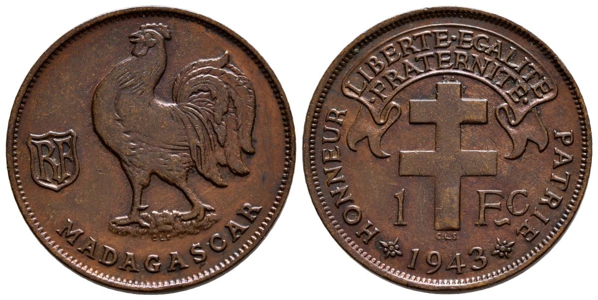 MADAGASCAR. 1 Franc. (Ae. 5,52g/25mm). 1943. Territorio Francés. (Km#2). MBC+.