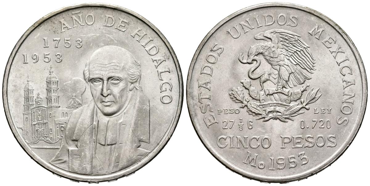 MEXICO. 5 Pesos. (Ar. 27,75g/39mm). 1953. Año de Hidalgo. (Km#468). EBC+.