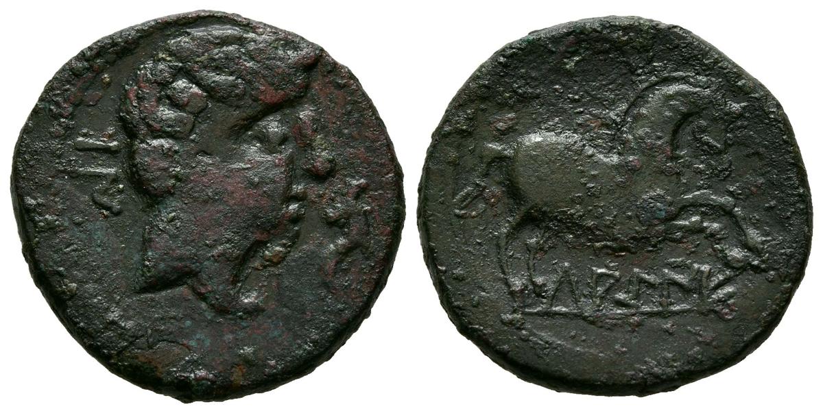 LAGINE (Fuente de Ebro, Zaragoza). Semis. (Ae. 4,23g/19mm). 120-20 a.C. (FAB-1657). Anv: Cabeza masculina a derecha, delante delfín, detrás letras ibéricas: BaN. Rev: Caballo a derecha, debajo leyenda ibérica: LAGiNE. MBC-. Escaso ejemplar.
