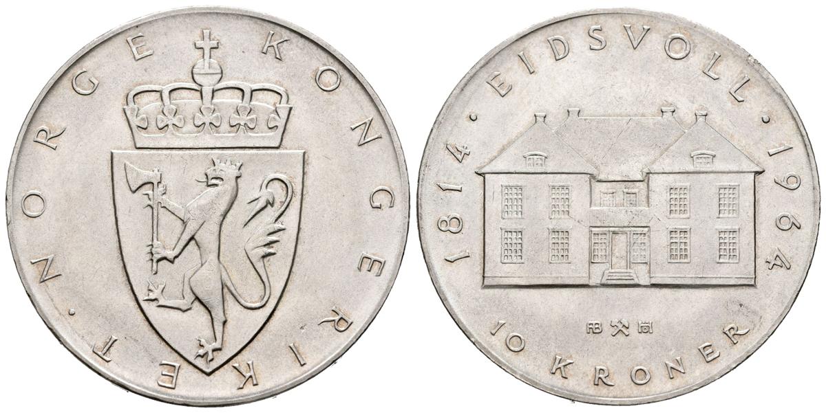 NORUEGA. 10 Coronas. (Ar. 20,12g/35mm). 1964. 150º Aniversario de la Constitución. (Km#413). EBC+.