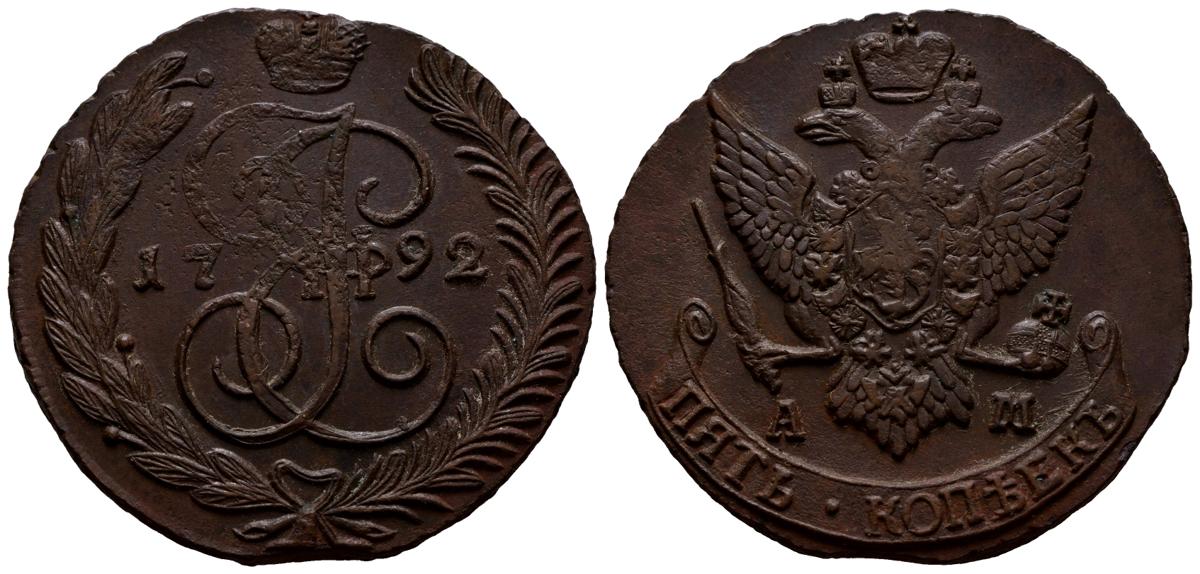 RUSIA, Catalina II (1762-1796). 5 Kopeks. (Ae. 44,34g/44mm). 1792 AM. (Bit#862). EBC. Bonito ejemplar.