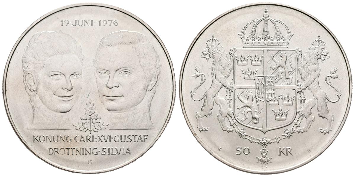 SUECIA. 50 Coronas. (Ar. 26,88g/36mm). 1976. Boda Real. (Km#854). EBC+.