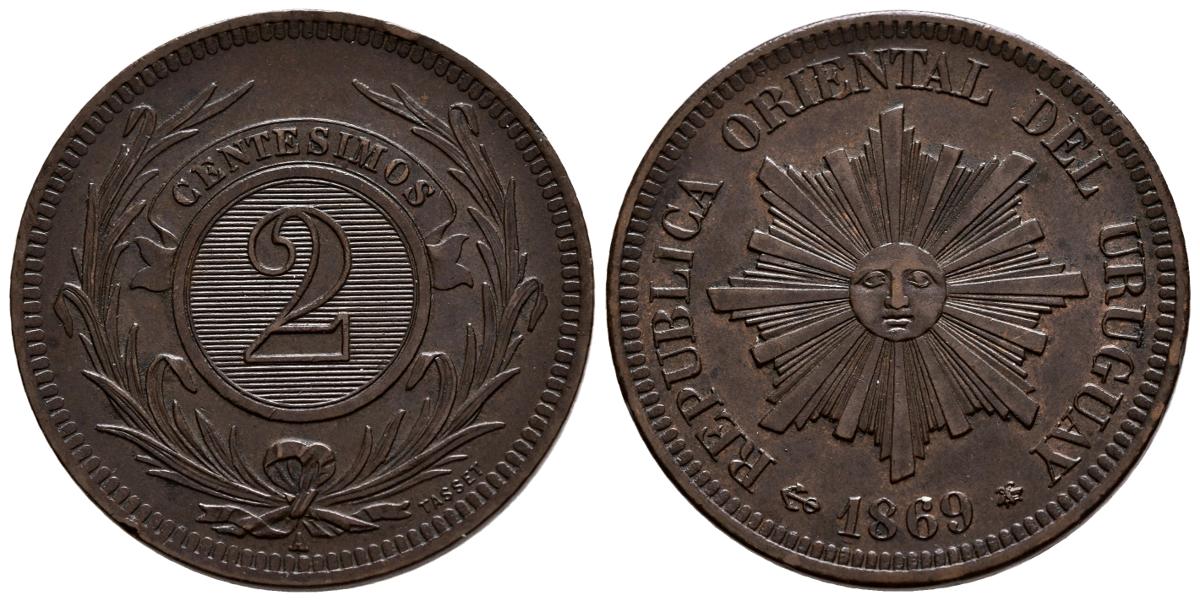URUGUAY. 2 Centésimos. (Ae. 9,78g/30mm). 1869. (Km#12). EBC. Buen ejemplar.