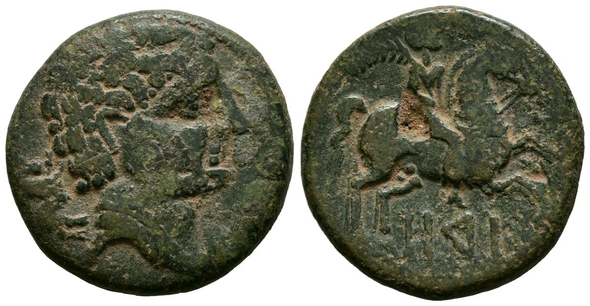 ORE (Orera, Zaragoza). As. (Ae. 12,07g/25mm). 120-20 a.C. (FAB-1897). Anv: Cabeza masculina a derecha, detrás toro. Rev: Jinete con palma a derecha, debajo leyenda ibérica: ORE. MBC. Pátina verde. Intento de perforación en reverso. Escaso ejemplar.