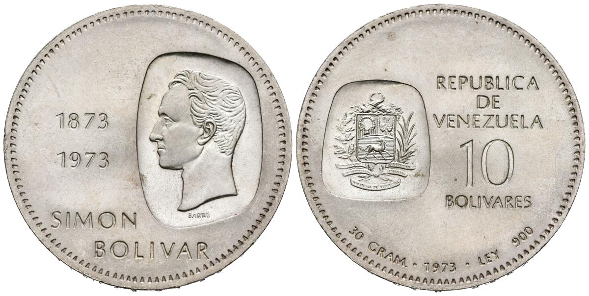 VENEZUELA. 10 Bolívares. (Ar. 30,11g/39mm). 1973. Centenario de la efigie de Simón Bolivar en la moneda (1873-1973). (Km#45). EBC+.