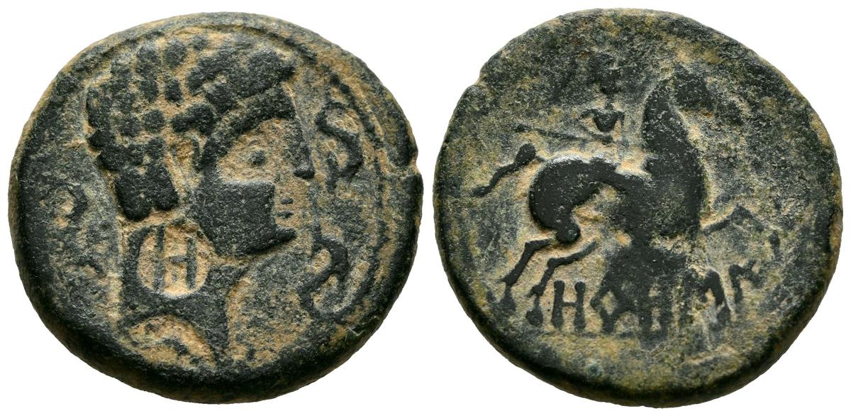 OROSIS (Zona media del Ebro). As. (Ae. 10,45g/25mm). 120-20 a.C. (FAB-1907). Anv: Cabeza masculina a derecha rodeada de tres delfines. Rev: Jinete con lanza a derecha, debajo leyenda: OROSI. MBC. Resello en anverso.