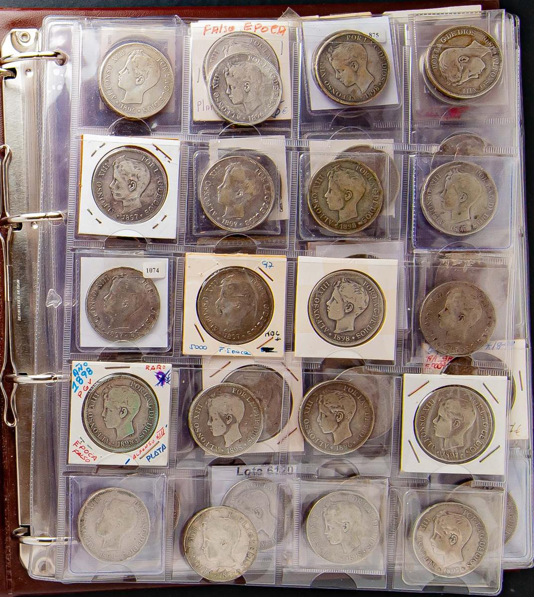 FALSAS DE ÉPOCA. Magnífico conjunto formado por más de 200 monedas, expuestas en 1 album, principalmente españolas de la etapa del Centenario de la Peseta, donde encontraremos una gran cantidad de módulos y materiales de acuñación entre los que se incluyen piezas en plata (también en otros materiales como latón, alpaca o calamina). El conjunto destaca por una amplio número de ejemplares de 5 Pesetas con diferentes bustos y fechas de los reinados de Alfonso XII y XIII. Diferentes estados de conservación. A EXAMINAR.